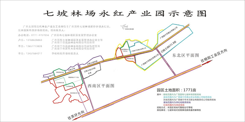 七坡林场永红产业园位于南宁市经开区吴圩镇七坡林场新桥分场永红站,园区面积1771亩,现有松、杉板方材加工商约250家,桉树旋切单板加工商约70家,同时有木材加工剩余物再生利用加工以及配套设施等,板方材深加工生产线正在组建,园区生产员工已有2000人。园区毗邻吴圩飞机场3公里,与明阳工业园相连2公里,苏圩至吴圩在建二级公路经过门口,交通便利,区位优势明显。现有三块场地出租,可用于林业贮木场相关业务经营,其中第一块为工业用地72亩,第二块为36亩,第三块为157.57亩。欢迎广大客商洽谈。